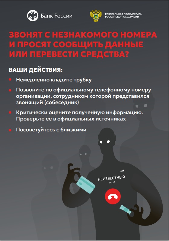 Ввиду возрастания угроз преступных посягательств Генеральной прокуратурой Российской Федерации совместно с Банком России разработаны цифровые плакаты (прилагаются) в целях повышения уровня информированности населения о действиях лиц, вводящих в заблуждение в целях хищения денежных средств.
